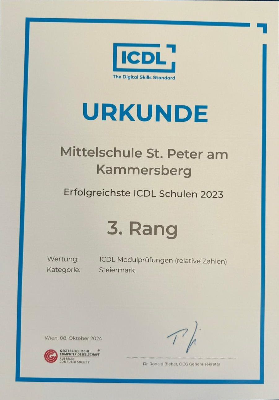 Die Mittelschule erreichte in diesem Schuljahr den 3. Rang in der Reihung der erfolgreichsten ICDL-Schulen steiermarkweit. Wir gratulieren allen teilnehmenden Schüler:innen herzlich zu den bestandenen Prüfungen und freuen uns gleichzeitig, dass unsere Schule für das Engagement im Bereich der digitalen Bildung ausgezeichnet wurde.